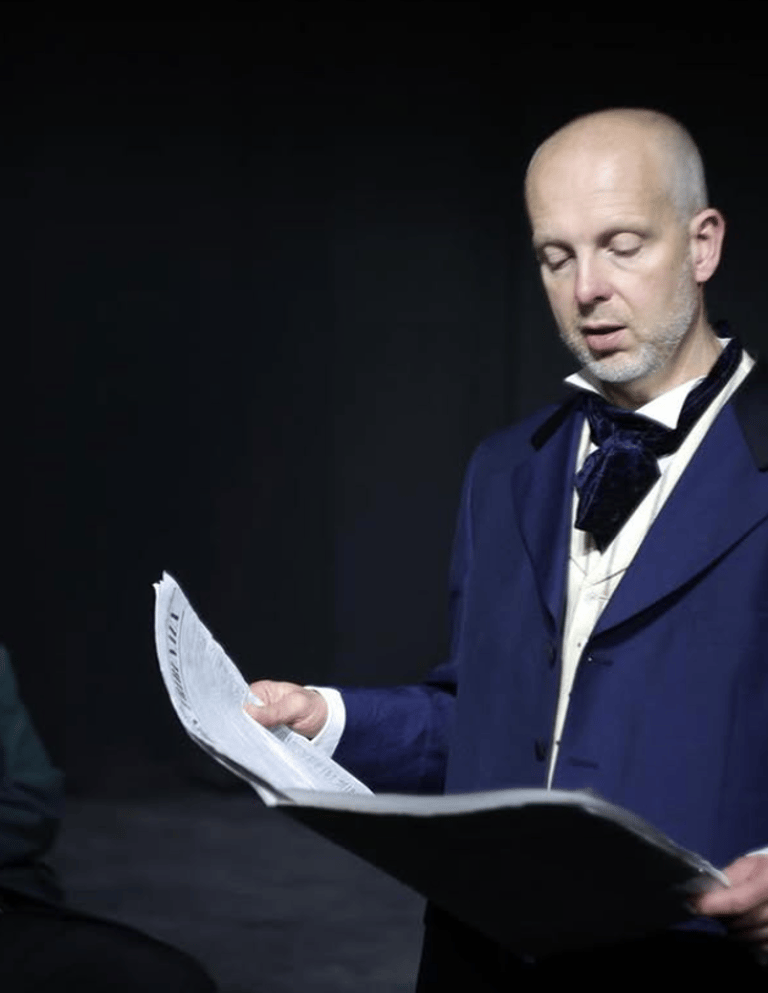 In Blue Orange Arts’ two-man adaptation of Edgar Allan Poe’s Murders in the Rue Morgue Alan Groucott & James Nicholas brought one of the earliest ‘detective stories’ to the stage. Poe’s character of C. August Dupin became the bases of the modern detective the likes of which inspired such characters as Sherlock Holmes, Mss Marple, and Jessica Fletcher.
